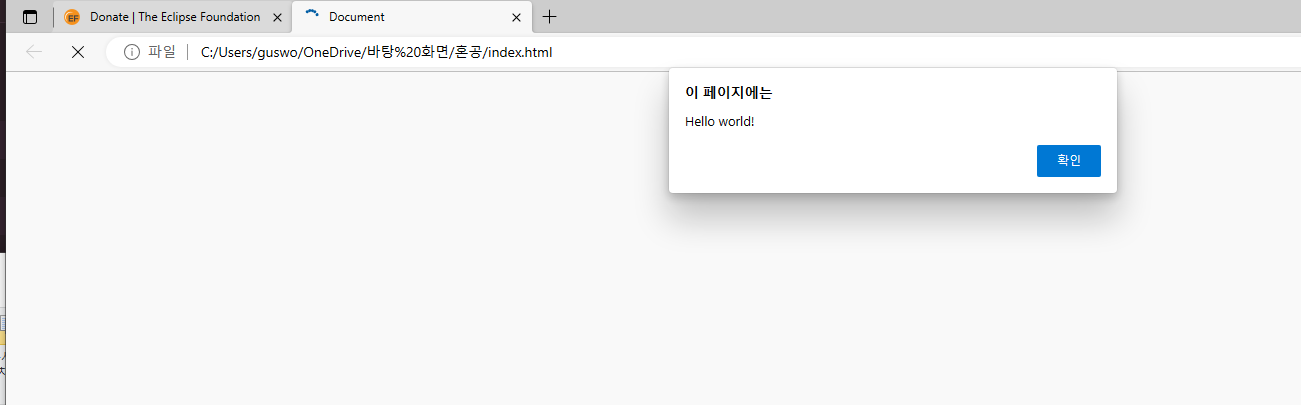 폴더에 있는 파일을 실행해주면 우리가 작성한대로 alert가 뜨는 것을 확인할 수 있다.