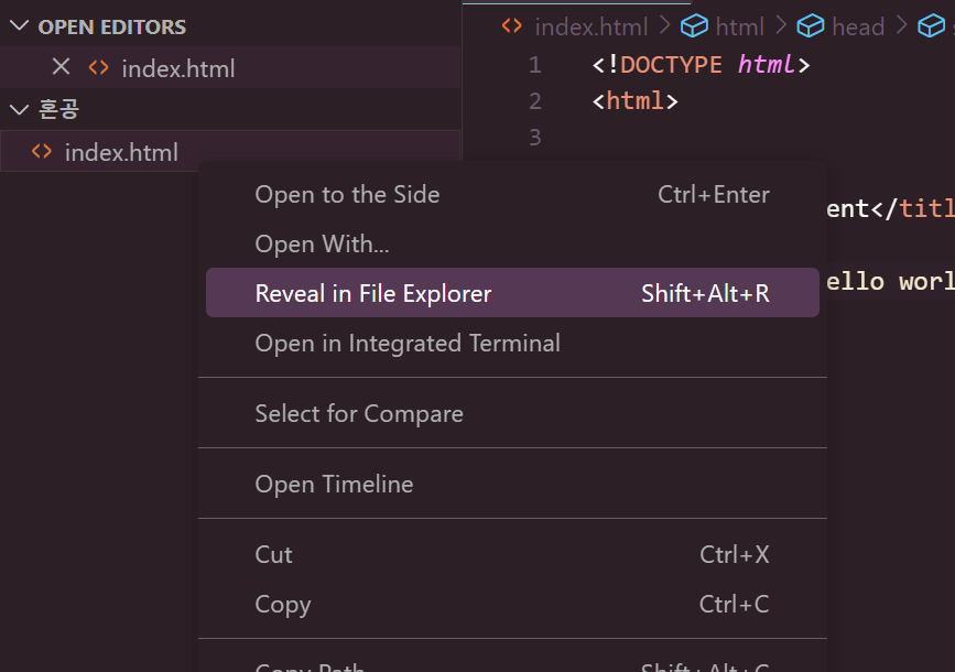 우리가 작성한 파일을 우클릭해서 파일탐색기에서 폴더를 열어주고