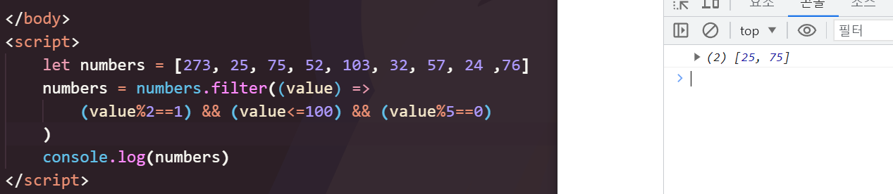 numbers 변수에 filter 메서드를 사용하면서 콜백함수는 화살표 함수로 작성해주었다.