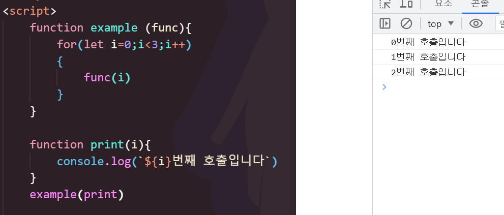 이렇게 매개변수로 전달되는 함수를 콜백 함수라고 함.