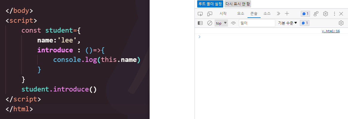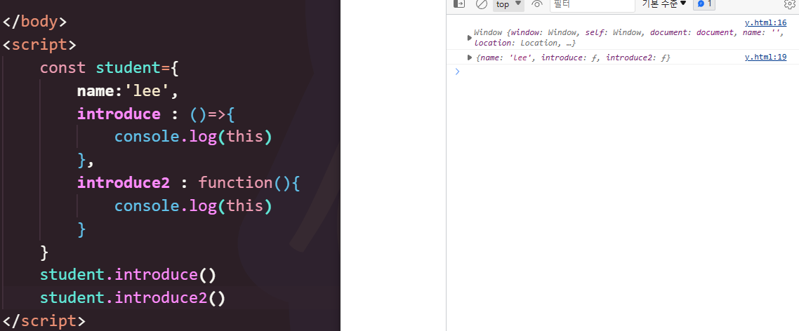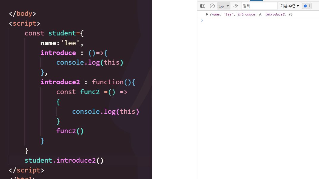 (객체 속에서 this는 속해있는 해당 객체 자체를 의미함. this.name이면 student 객체 속에 있으므로