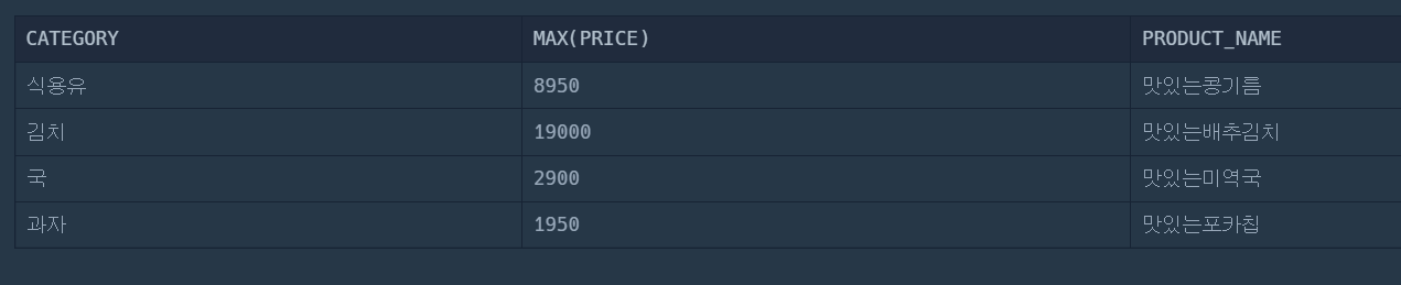 아까 코드 결과다. MAX(PRICE)로 과자 카테고리별 가장 비싼 가격은 1950원인 것을 찾아냈지만