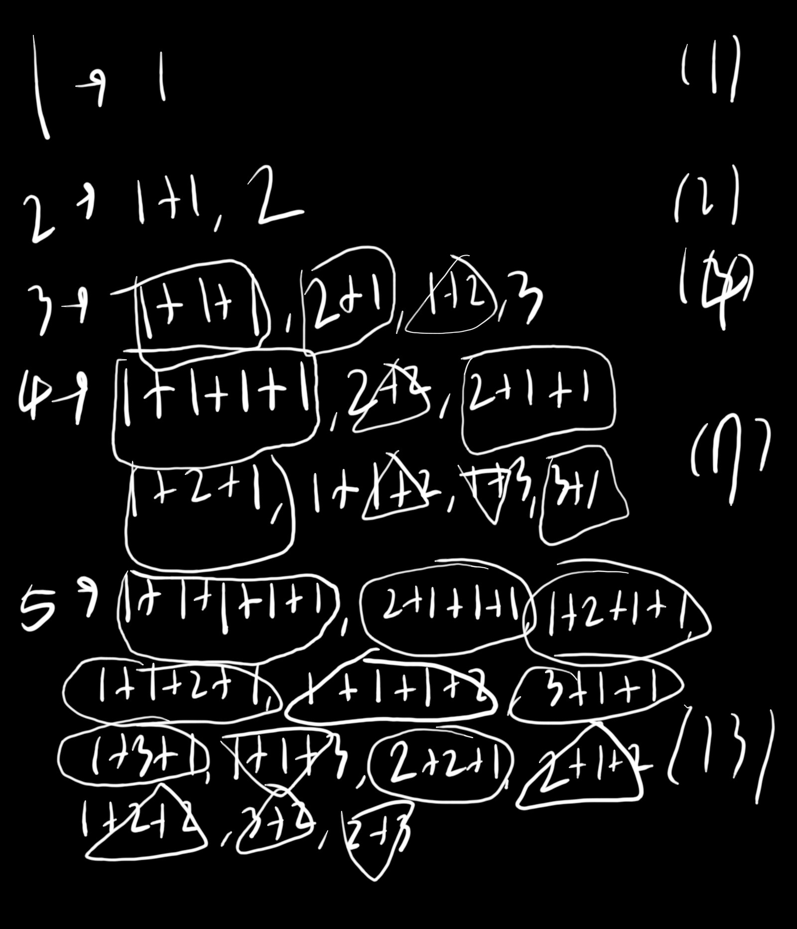 네모를 친 1+1+1+1, 2+1+1, 1+2+1, 3+1은 4보다 1 작은 3의 네가지 경우의 수의 뒤에 1을 더한 형태