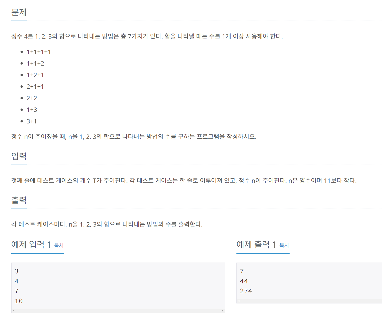 각 숫자를 1,2,3의 합으로 구하는 방법을 쭉 적어보다가 규칙을 발견할 수 있었다.