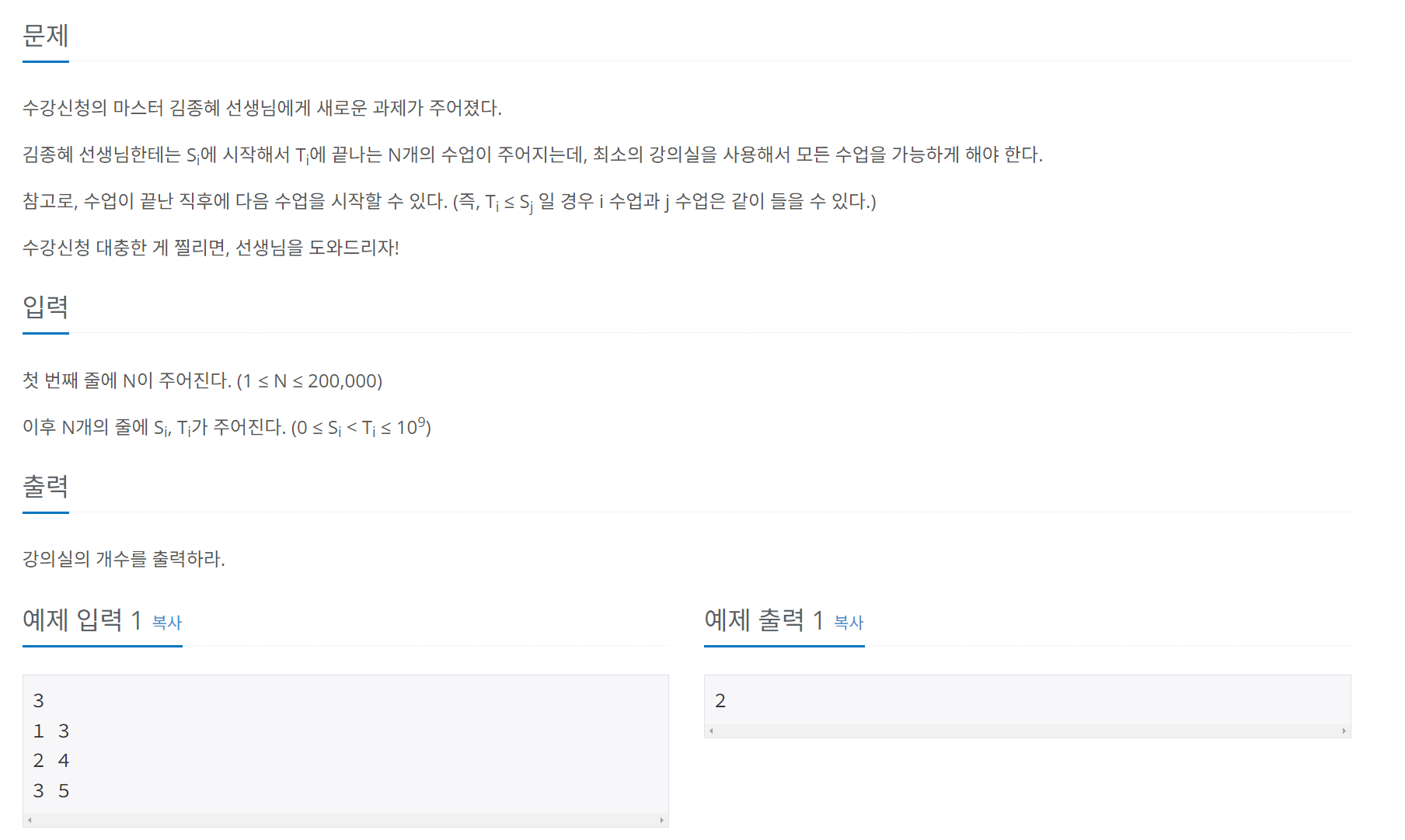 첫 번째 줄에 N이 주어진다. (1 ≤ N ≤ 200,000) 이후 N개의 줄에 Si, Ti가 주어진다. (0 ≤ Si < Ti ≤ 109)